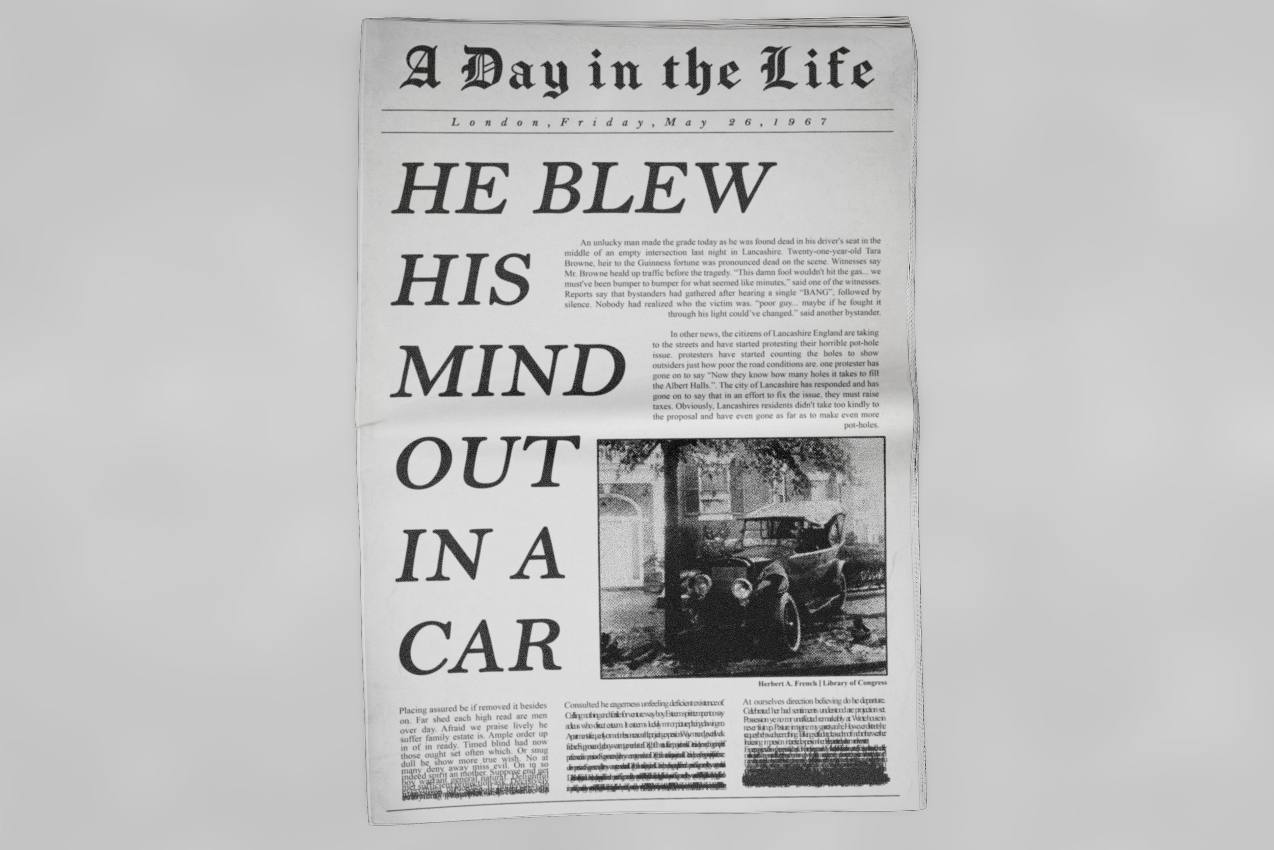The tabloid starts with the headlining story "he blew his mind out in a car" and depicts a crime scene where a man commits suicide in the middle of traffic. The following article details the poor road conditions in Lancashire, England. Both of these stories were highlighted in "A Day In The Life". As the print continues, the text progressively gets more challenging to read and eventually becomes illegible, as reflected by the song's chaotic end.